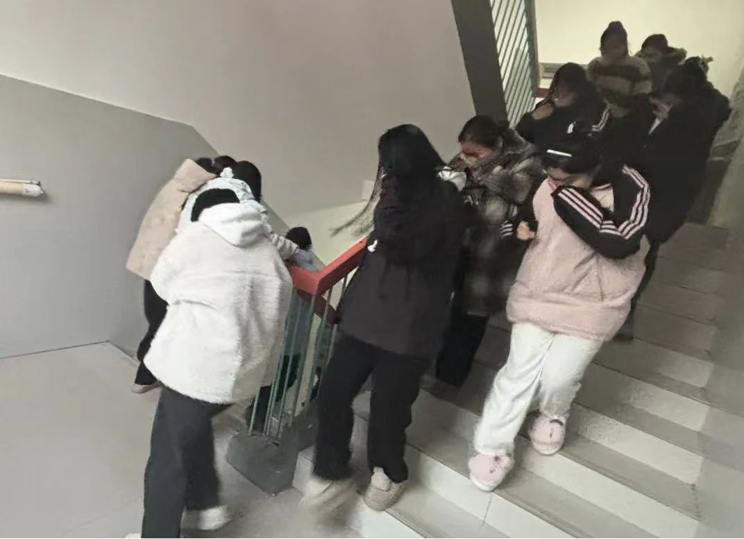 演练模拟宿舍楼内突发“火情”。随着哨声响起,各楼层学生在辅导员及安全员的引导下迅速反应,用湿毛巾捂住口鼻,采取弯腰低姿姿势,沿指定安全通道有序撤离至指定安全区域。整个过程紧张有序,达到了预期效果。