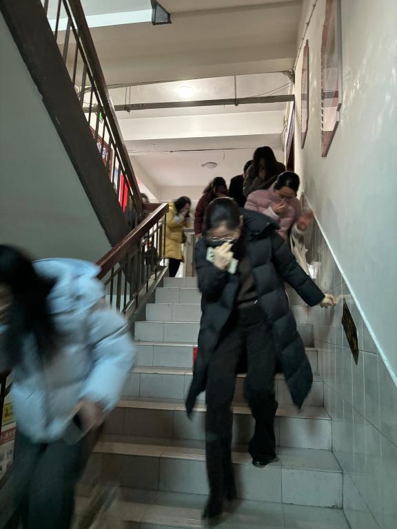 理论培训后,实战消防演练随即展开。随着模拟火灾警报响起,教师们在教官引导下,用湿毛巾或衣物捂鼻,弯腰低姿,按预定路线快速有序撤离至安全区域,整个过程紧张有序,圆满完成疏散演练。