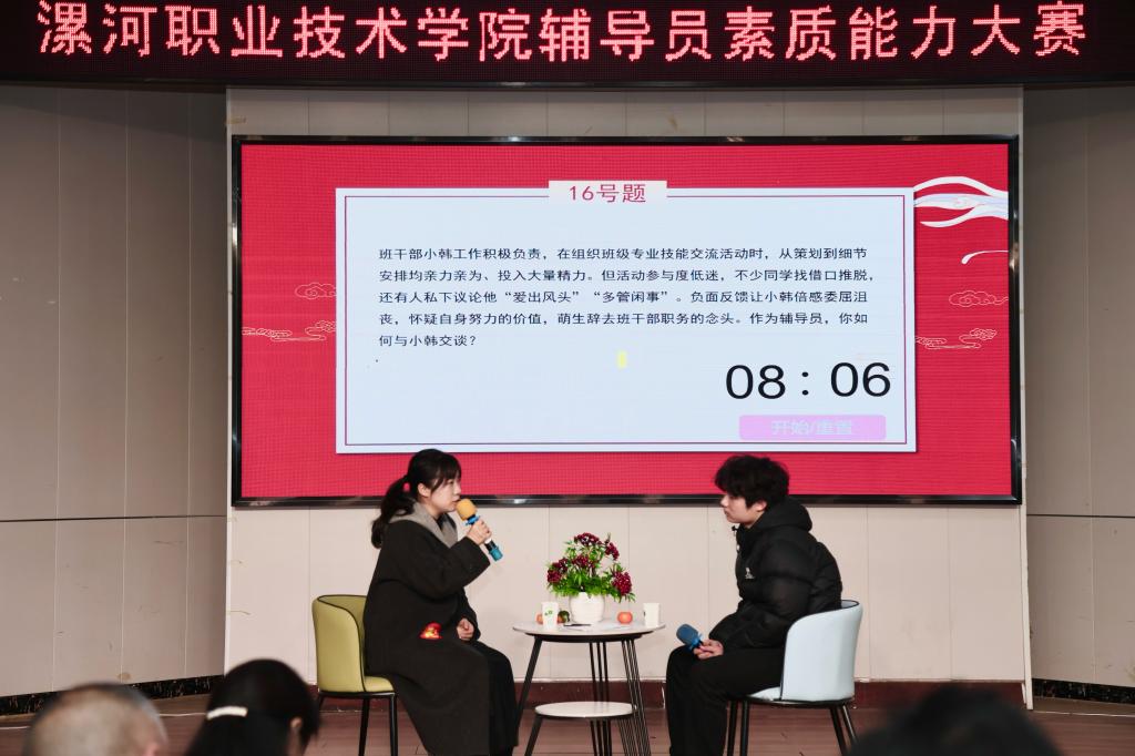 本次大赛设置基础知识测试、案例研讨、谈心谈话等多环节,全面考察辅导员的理论素养、语言表达、逻辑思维、应急处理等综合素质能力。比赛中,罗嘉文老师沉着应战,凭借对学生工作规律的深刻理解、对学生成长需求的精准把握以及丰富的实践经验,在各个环节表现精彩,充分展现了我院辅导员队伍的专业素养与卓越风采。