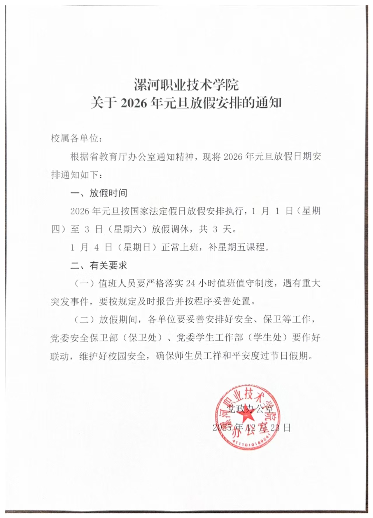 漯河职业技术学院关于2026年元旦放假安排的通知